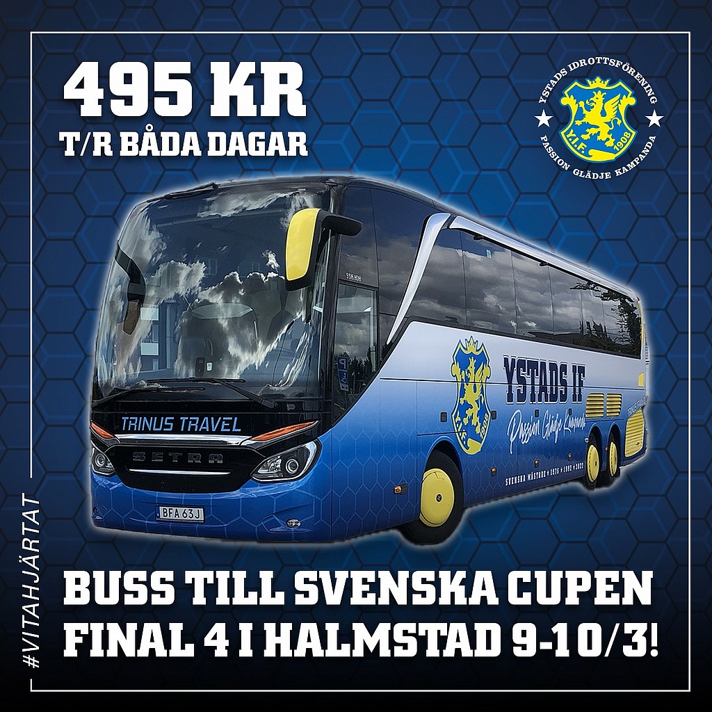 Nu erbjuder vi möjlighet att åka buss med alla andra YIF-supporters till och från Halmstad både lördag och söndag. Priset för bussbiljetten avser plats på bussen båda dagarna. (Om man väljer att stanna i Halmstad över natten mellan lördag och söndag har man såklart fortfarande kvar sin plats kvar på bussen hem på söndagen.)